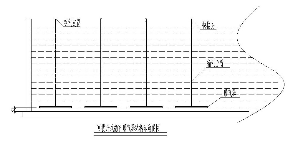 2、在已運(yùn)行的曝氣器的效率低或堵塞頻繁不便維修時,可用可提升曝氣管進(jìn)行改造,提高增氧能力和攪拌效果。